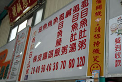 | 壁掛けのメニュー | テーブルの上の調味料 | 虱目魚肚粥(120元・約384円)と油條(10元・約32円) |