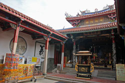 次に、海の守護神であり、万能の女神とされる媽祖を祀った大天后宮へ。ここはもともとは明朝最後の王の邸宅だったのだそうだ。また、ここに祀られている月下老人像(縁結びの神様)は台湾最古のものといわれ、ご利益があるとか。 |